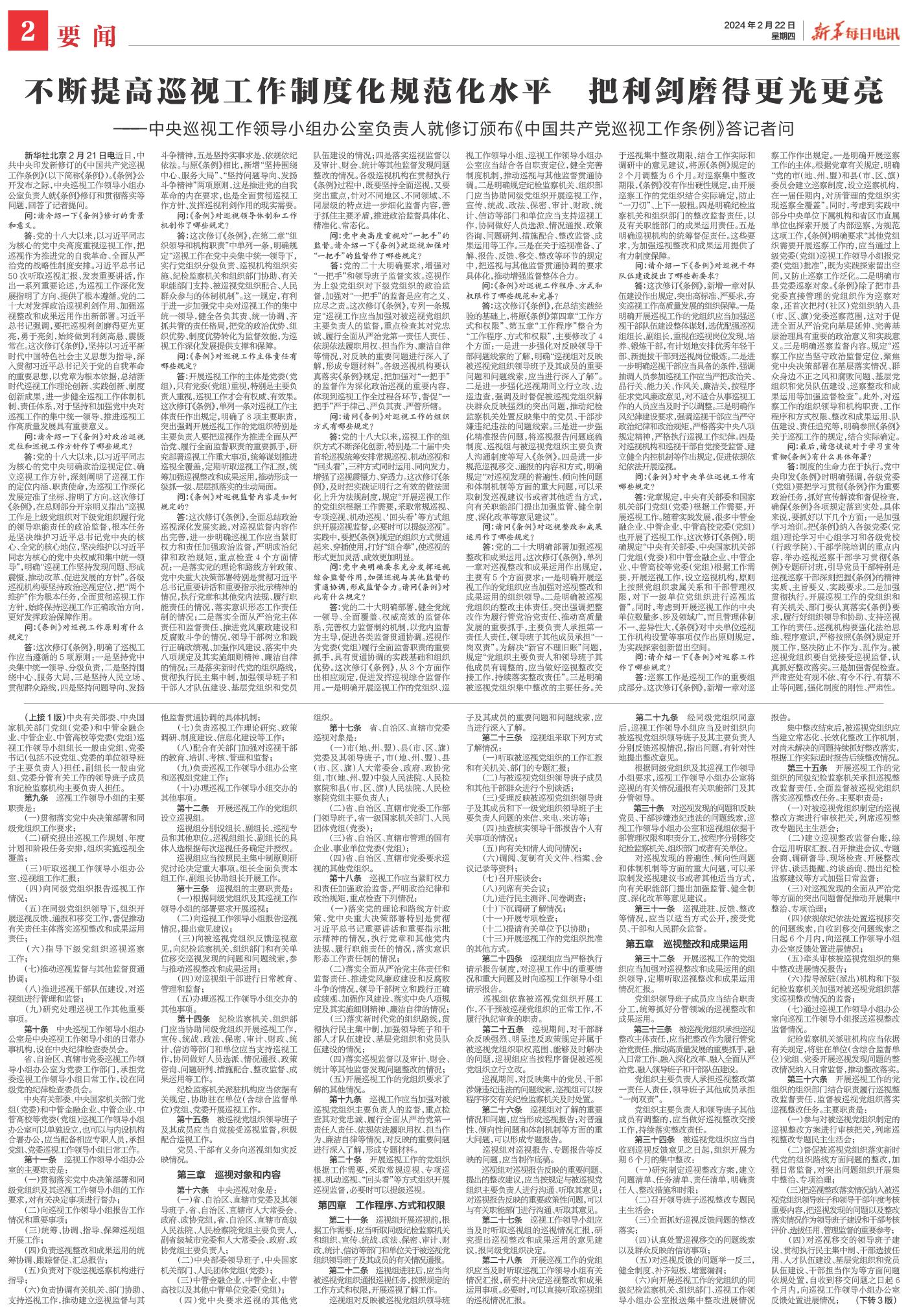 新华社北京2月21日电近日,中共中央印发新修订的《中国共产党巡视工作条例》(以下简称《条例》)。《条例》公开发布之际,中央巡视工作领导小组办公室负责人就《条例》修订和贯彻落实等问题,回答了记者提问。