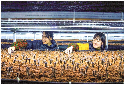 ▲2月23日,在红石林镇铁马洲村食用菌种植基地,村民在采收黑皮鸡枞菌。 近日,湖南省湘西土家族苗族自治州古丈县红石林镇铁马洲村种植的食用菌喜获丰收,村民忙着采收,供应市场。据了解,湖南省科协驻铁马洲村工作队利用当地气候适宜、原料充足等条件,规模化种植黑皮鸡枞菌等食用菌,在湖南省山东商会支持下,打通食用菌上下游产业链,有效促进村民增收,助力乡村振兴。 新华社记者陈思汗摄