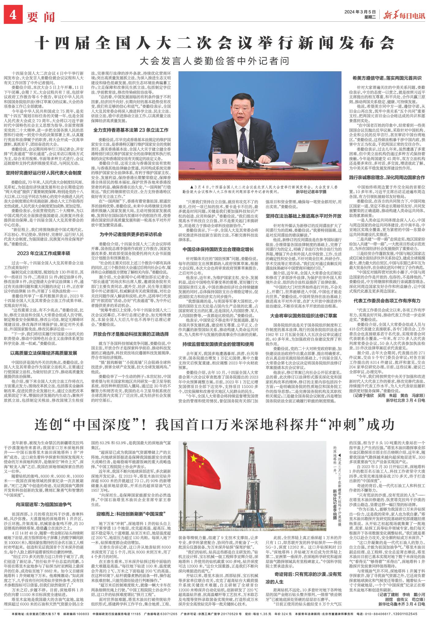 十四届全国人大二次会议4日中午举行新闻发布会,大会发言人娄勤俭就会议议程和人大有关工作回答了中外记者提问。