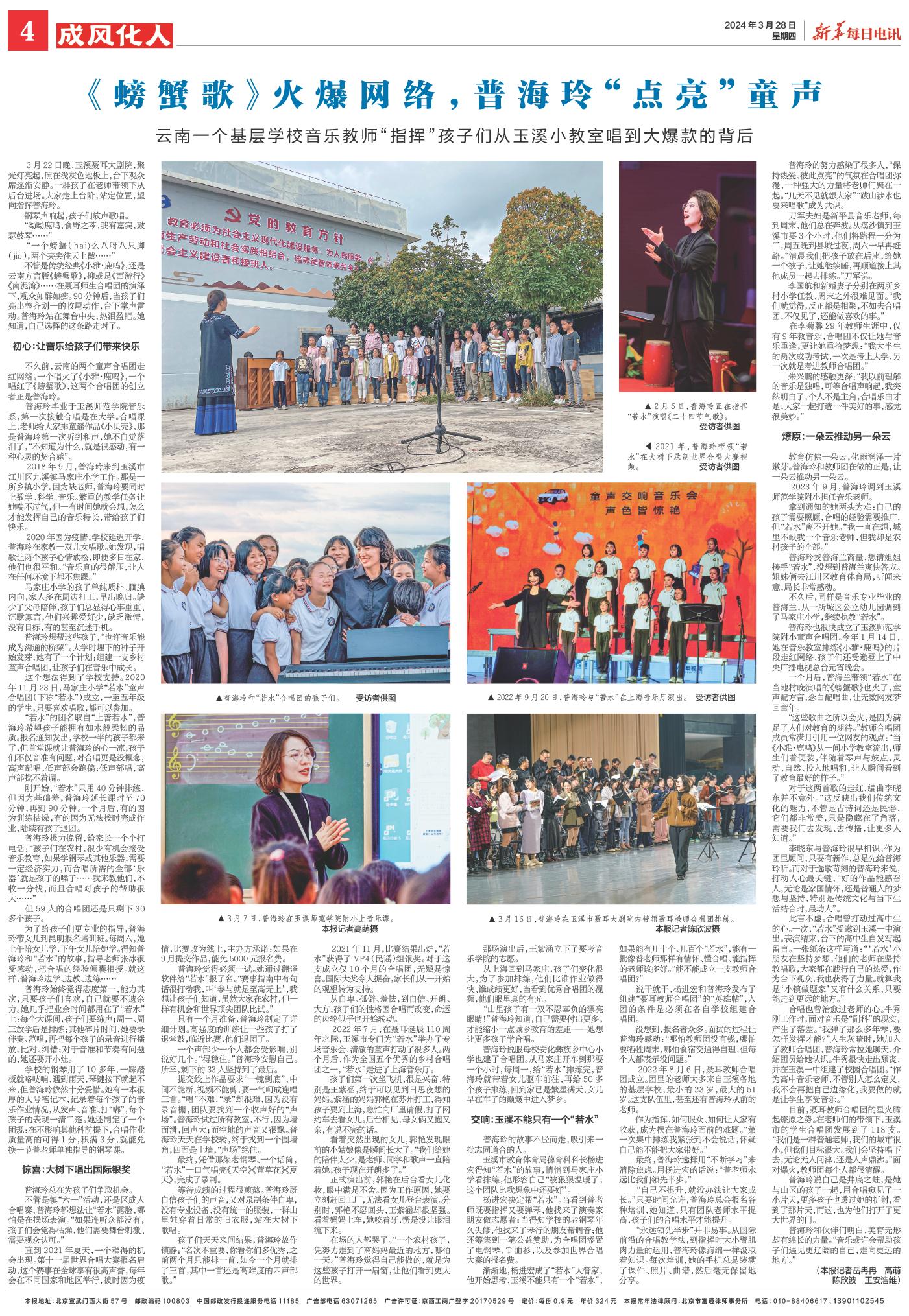 普海玲也很快成立了玉溪师范学院附小童声合唱团。今年1月14日,她在音乐教室排练《小雅·鹿鸣》的片段走红网络,孩子们还受邀登上了中央广播电视总台元宵晚会。