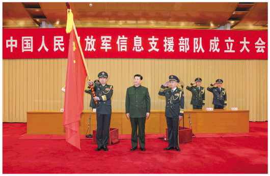 ▲4月19日,中国人民解放军信息支援部队成立大会在北京八一大楼隆重举行。中共中央总书记、国家主席、中央军委主席习近平向信息支援部队授予军旗并致训词。这是习近平致训词。