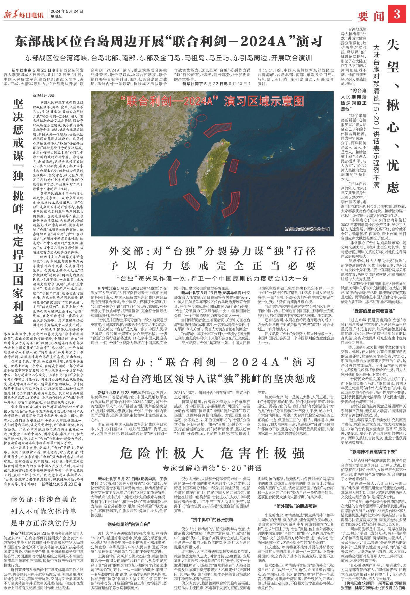 新华社南京5月23日电东部战区新闻发言人李熹海军大校表示,5月23日至24日,中国人民解放军东部战区组织战区陆军、海军、空军、火箭军等兵力,位台岛周边开展“联合利剑-2024A”演习,重点演练联合海空战备警巡、联合夺取战场综合控制权、联合精打要害目标等科目,舰机抵近台岛周边战巡,岛链内外一体联动,检验战区部队联合作战实战能力。这也是对“台独”分裂势力谋“独”行径的有力惩戒,对外部势力干涉挑衅的严重警告。