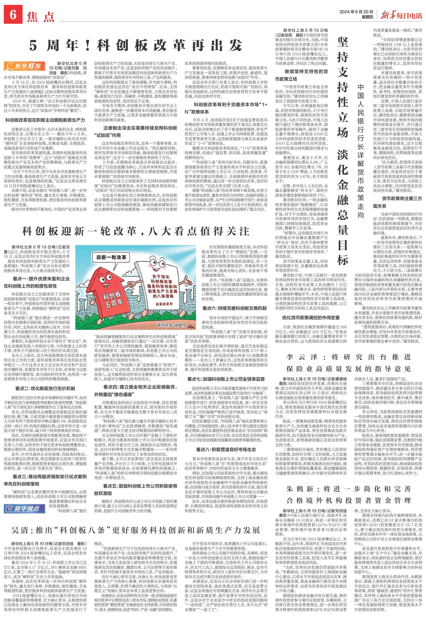 新华社上海6月19日电(记者刘羽佳 桑彤)今年是科创板设立五周年。证监会主席吴清在19日举行的2024陆家嘴论坛上宣布,证监会将发布深化科创板改革八条措施。