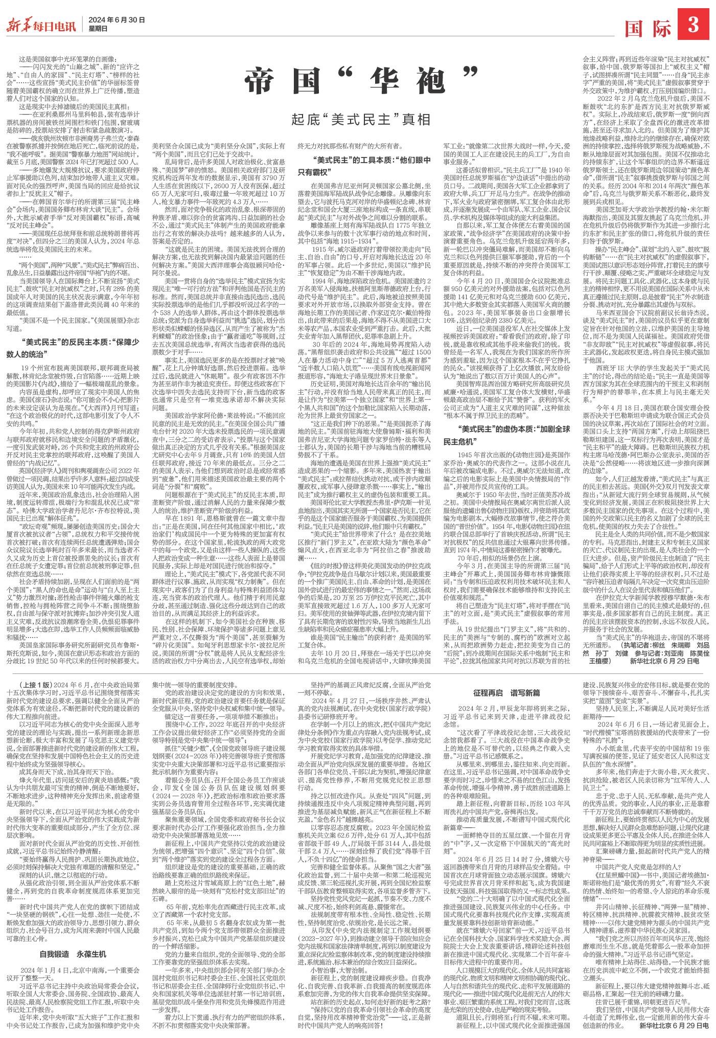 当“美式民主”的华袍退去,帝国的不堪将无所遁形。 (执笔记者:柳丝 朱瑞卿 刘品然 孙丁 刘健 参与记者:刘亚南 陈昊佺 王植樱) 新华社北京6月29日电