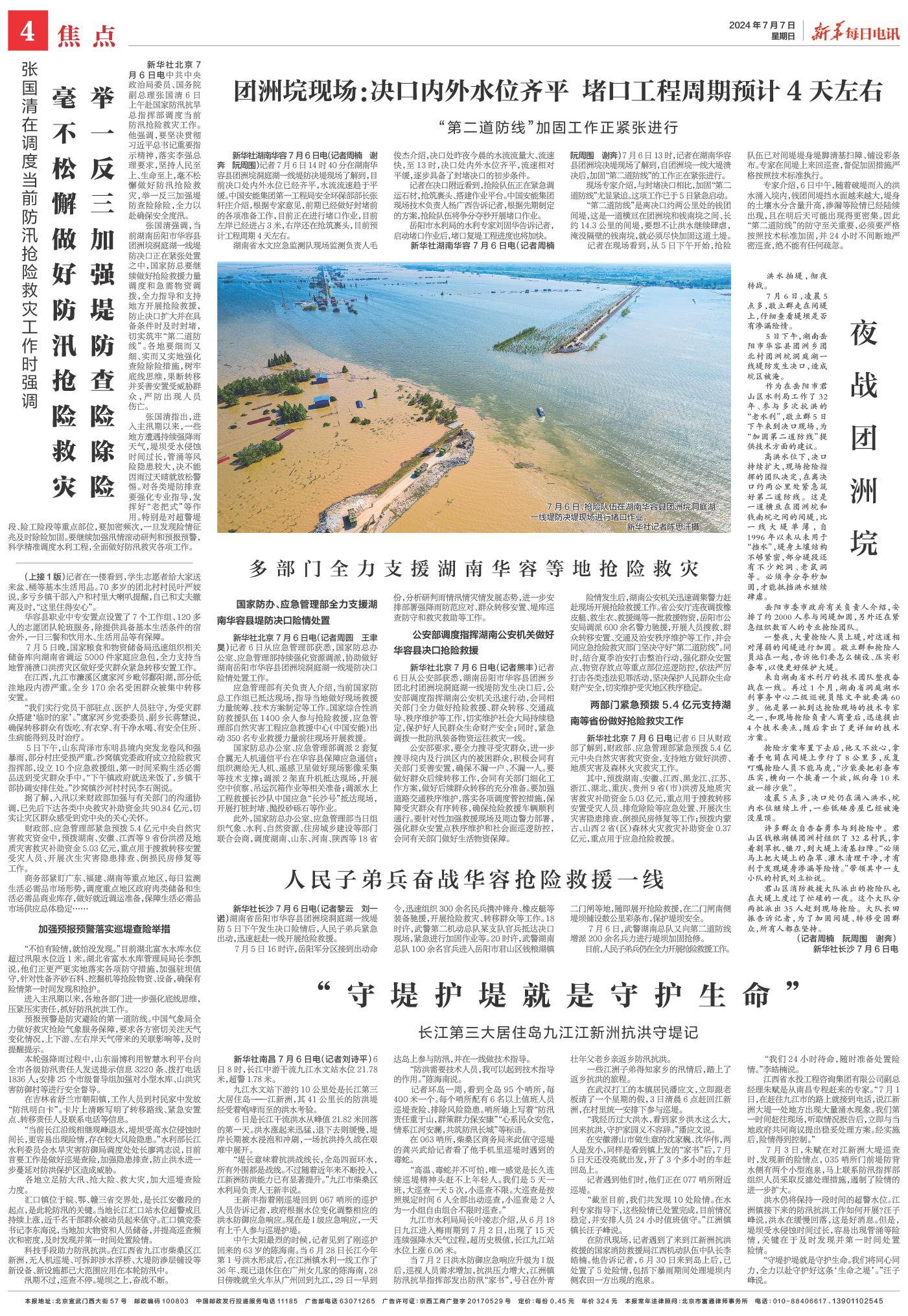 张国清强调,当前湖南岳阳市华容县团洲垸洞庭湖一线堤防决口正在紧张处置之中,国家防总要继续做好抢险救援力量调度和急需物资调拨,全力指导和支持地方开展抢险救援,防止决口扩大并在具备条件时及时封堵,切实筑牢“第二道防线”。各地要细而又细、实而又实地强化查险除险措施,树牢底线思维,果断转移并妥善安置受威胁群众,严防出现人员伤亡。
