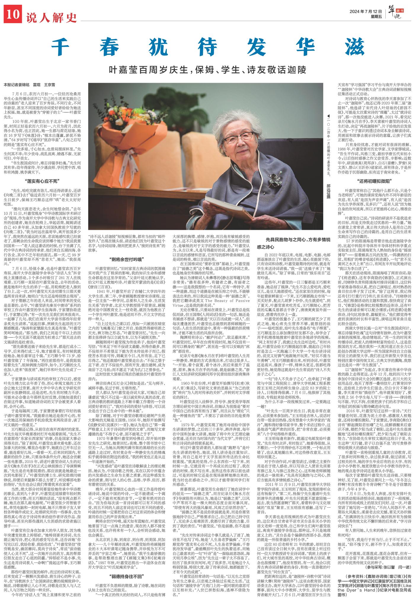 2016年,叶嘉莹写过这样一首诗:“天行常健老何妨,花落为泥土亦香。感激故人相勉意,还将初曙拟微阳。”于家慧说,李商隐《燕台》诗有“醉起微阳若初曙”之句,说醉酒醒来后意识不清,错把夕阳当成了朝阳。这是叶先生很清醒地“还将初曙拟微阳”,把夕阳当成了朝阳去努力。“在协助先生审校文稿的这段日子里,先生这种‘天行健,君子以自强不息’的可贵修养带给我极大的感动与鼓励。”