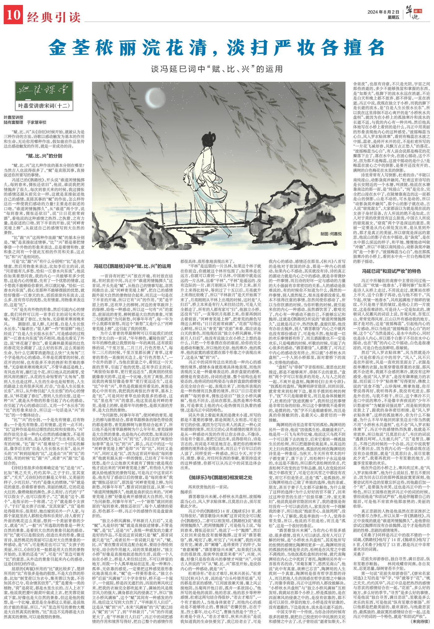 “平林”是远望的一片丛林,如果这个林子就在你前边,你就被这个林所包围了;如果林是在远方,你就可以看到一片丛林,中国画中就是远远的一片丛林,远看“平林”。“平林”是遥远的、没有边际的一片,新月刚刚从平林上升上来。新月升上来得比较早,等到过了十五以后,月亮就升上来得比较晚了。所以“平林新月”是天开始黑下来了,月亮刚刚从平林上出现的时候,这时是“人归后”。桥上本来是有行人来往经过的,可是人完全都走了,所有的人都有家可“归”。他独立小桥,还没有“归”,一直等到月亮都上来。你要再倒回去看前面,“河畔青芜堤上柳”,把青芜的颜色写得这么鲜明;“日日花前常病酒”,“花前”写得这么鲜明。所以从“青芜”跟“花前”来看,那应该是白天的景色。而他现在说“独立小桥风满袖,平林新月人归后”。他没有说独立在小桥之上想的是什么,只把一个形象摆在你的眼前,给你的完全是感动和触发。所以他的无依、他的寒冷、他的孤单、他的寂寞的感觉都在那个形象之中表现出来了,这是从“赋”到“兴”。