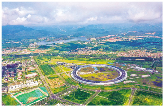 ▲鸟瞰高能同步辐射光源(8月18日摄)。记者8月19日从中国科学院高能物理研究所获悉,国家重大科技基础设施——高能同步辐射光源(HEPS)储存环日前成功实现束流存储,束流流强超过10毫安。
