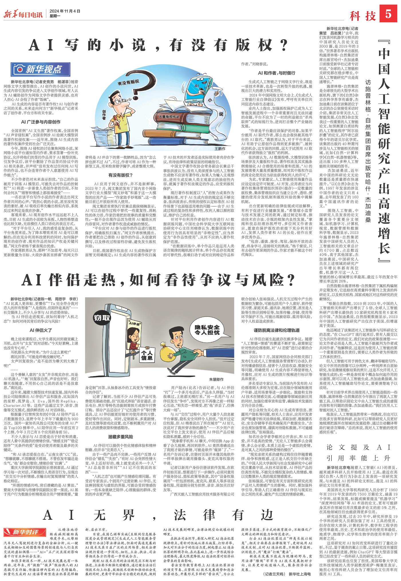 出台更新明确的法律法规或司法解释,有利于促进行业健康发展。“希望缩小监管与技术发展之间的距离,通过制定标准,推动技术在合法、合规的框架内良性发展。”掌阅科技总经理孙凯呼吁。多位网文作者表示,愿意在保护版权的前提下充分利用好AI,发挥人类作者和AI的长处,创作出更多优秀作品。