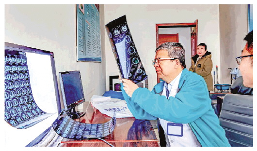 ▲11月26日,在铁岭市西丰县明德满族乡,于韬院长查看患者的X光片。 |