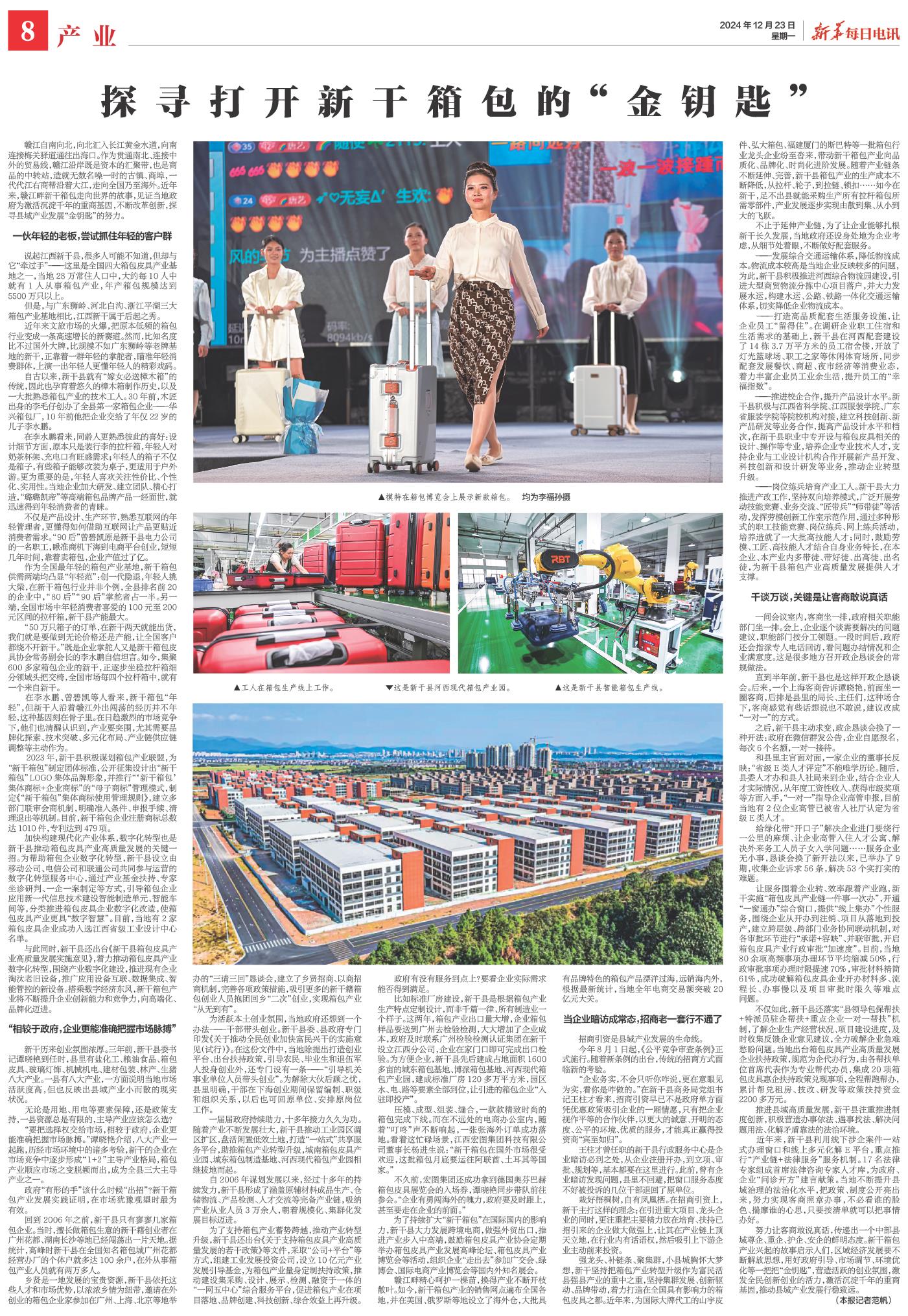 在李水鹏、曾碧凯等人看来,新干箱包“年轻”,但新干人沿着赣江外出闯荡的经历并不年轻,这种基因刻在骨子里。在日趋激烈的市场竞争下,他们也清醒认识到,产业要突围,尤其需要品牌化探索、技术突破、多元化布局、产业链供应链调整等主动作为。