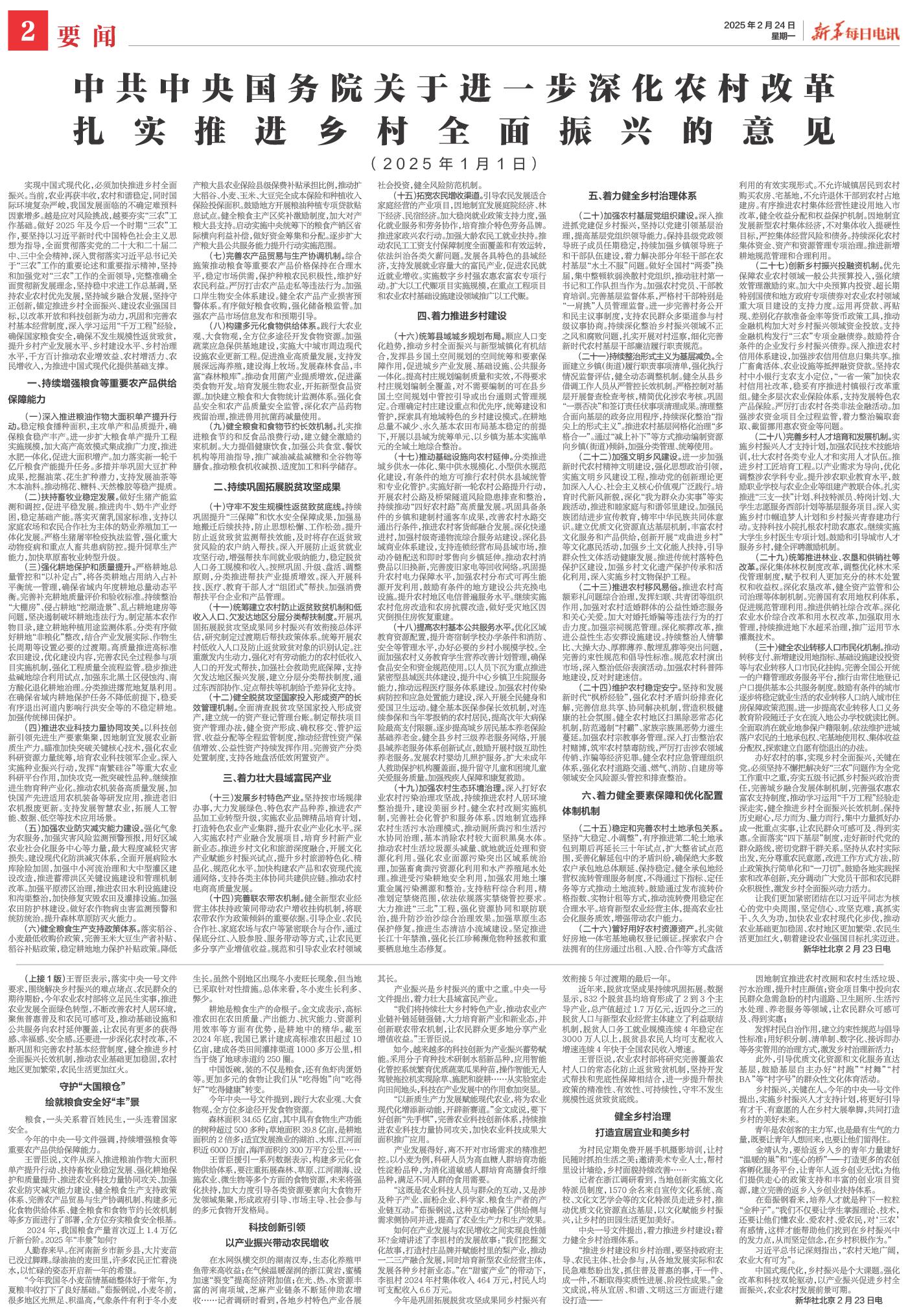 实现中国式现代化,必须加快推进乡村全面振兴。当前,农业再获丰收,农村和谐稳定,同时国际环境复杂严峻,我国发展面临的不确定难预料因素增多。越是应对风险挑战,越要夯实“三农”工作基础。做好2025年及今后一个时期“三农”工作,要坚持以习近平新时代中国特色社会主义思想为指导,全面贯彻落实党的二十大和二十届二中、三中全会精神,深入贯彻落实习近平总书记关于“三农”工作的重要论述和重要指示精神,坚持和加强党对“三农”工作的全面领导,完整准确全面贯彻新发展理念,坚持稳中求进工作总基调,坚持农业农村优先发展,坚持城乡融合发展,坚持守正创新,锚定推进乡村全面振兴、建设农业强国目标,以改革开放和科技创新为动力,巩固和完善农村基本经营制度,深入学习运用“千万工程”经验,确保国家粮食安全,确保不发生规模性返贫致贫,提升乡村产业发展水平、乡村建设水平、乡村治理水平,千方百计推动农业增效益、农村增活力、农民增收入,为推进中国式现代化提供基础支撑。