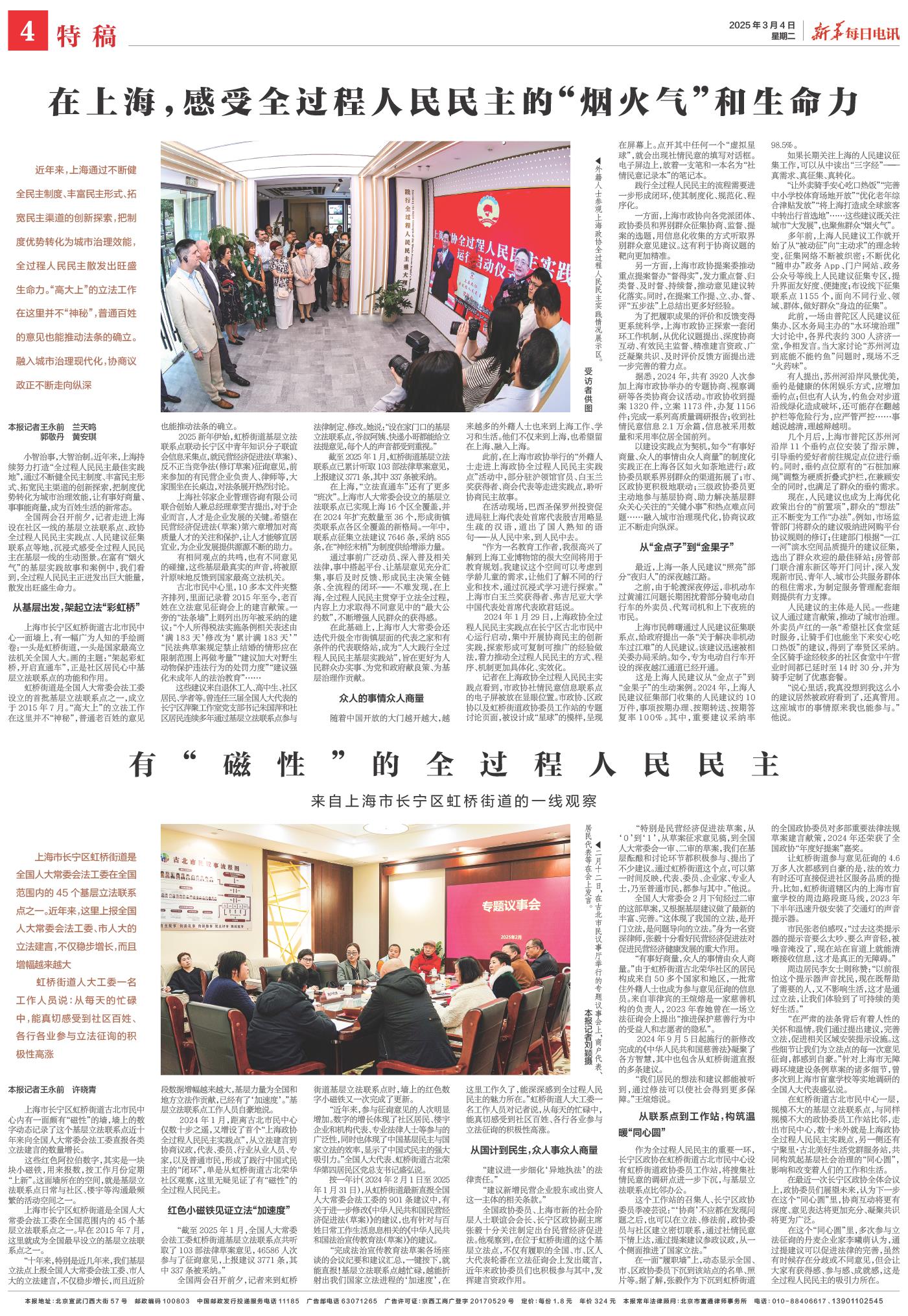 全国两会召开前夕,记者走进上海设在社区一线的基层立法联系点、政协全过程人民民主实践点、人民建议征集联系点等地,沉浸式感受全过程人民民主在基层一线的生动图景。在富有“烟火气”的基层实践故事和案例中,我们看到,全过程人民民主正迸发出巨大能量,散发出旺盛生命力。