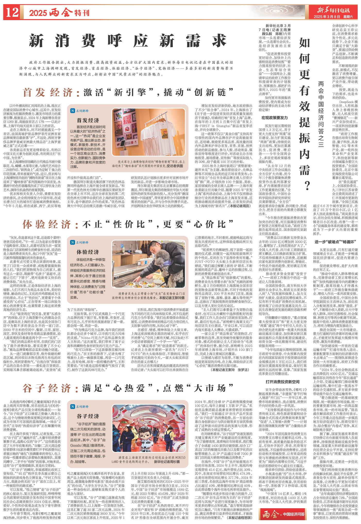 政府工作报告提出,大力提振消费、提高投资效益,全方位扩大国内需求。新华每日电讯记者在中国最大的经济中心城市上海调研发现,首发经济、首店经济、体验经济、“谷子经济”、宠物经济……多姿多彩的新消费场景不断涌现,与人民群众的新需求互为呼应,折射出中国“风景正好”的经济魅力。