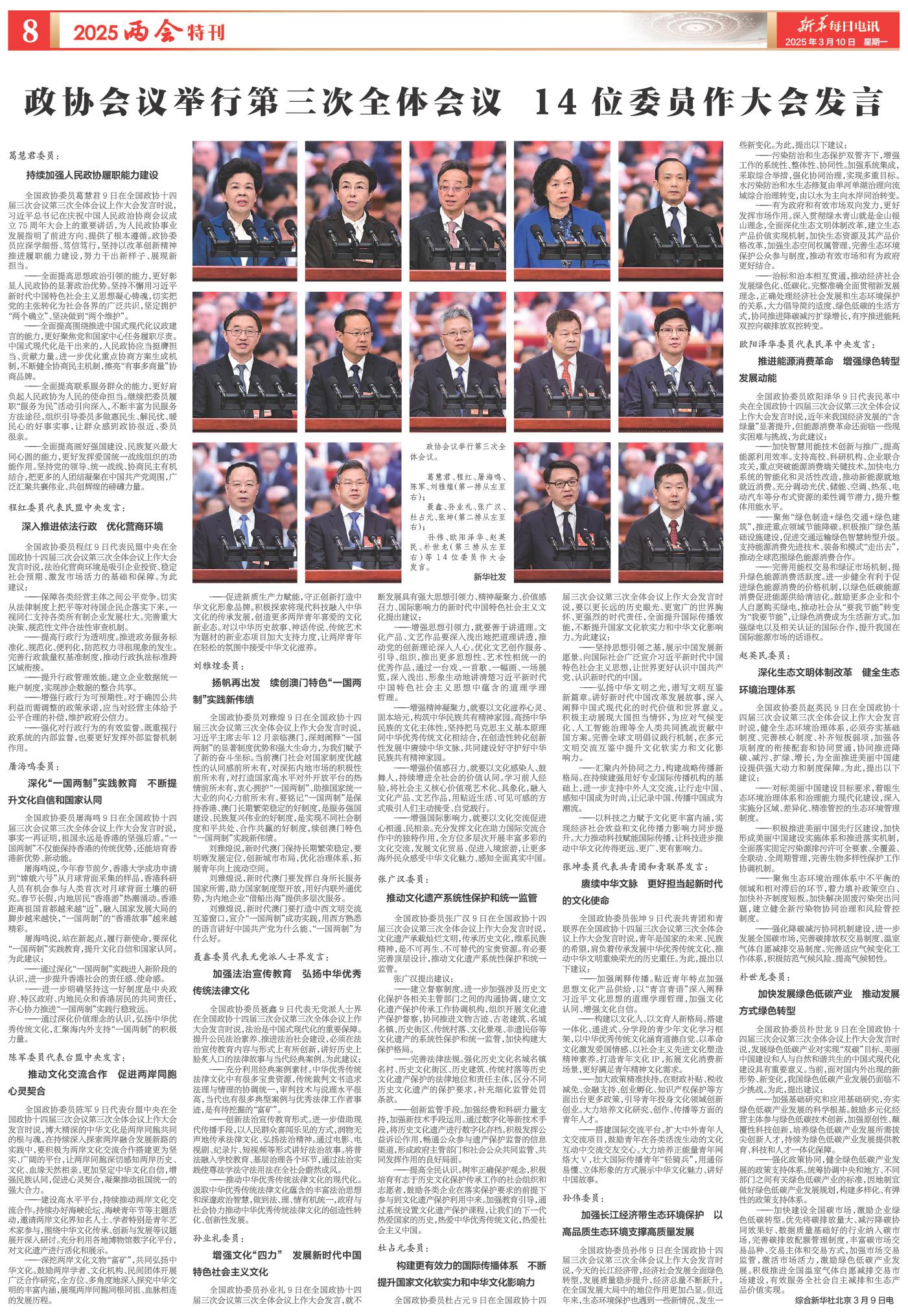 全国政协委员张广汉9日在全国政协十四届三次会议第三次全体会议上作大会发言时说,文化遗产承载灿烂文明,传承历史文化,维系民族精神,是不可再生、不可替代的宝贵资源。有必要完善顶层设计,推动文化遗产系统性保护和统一监管。
