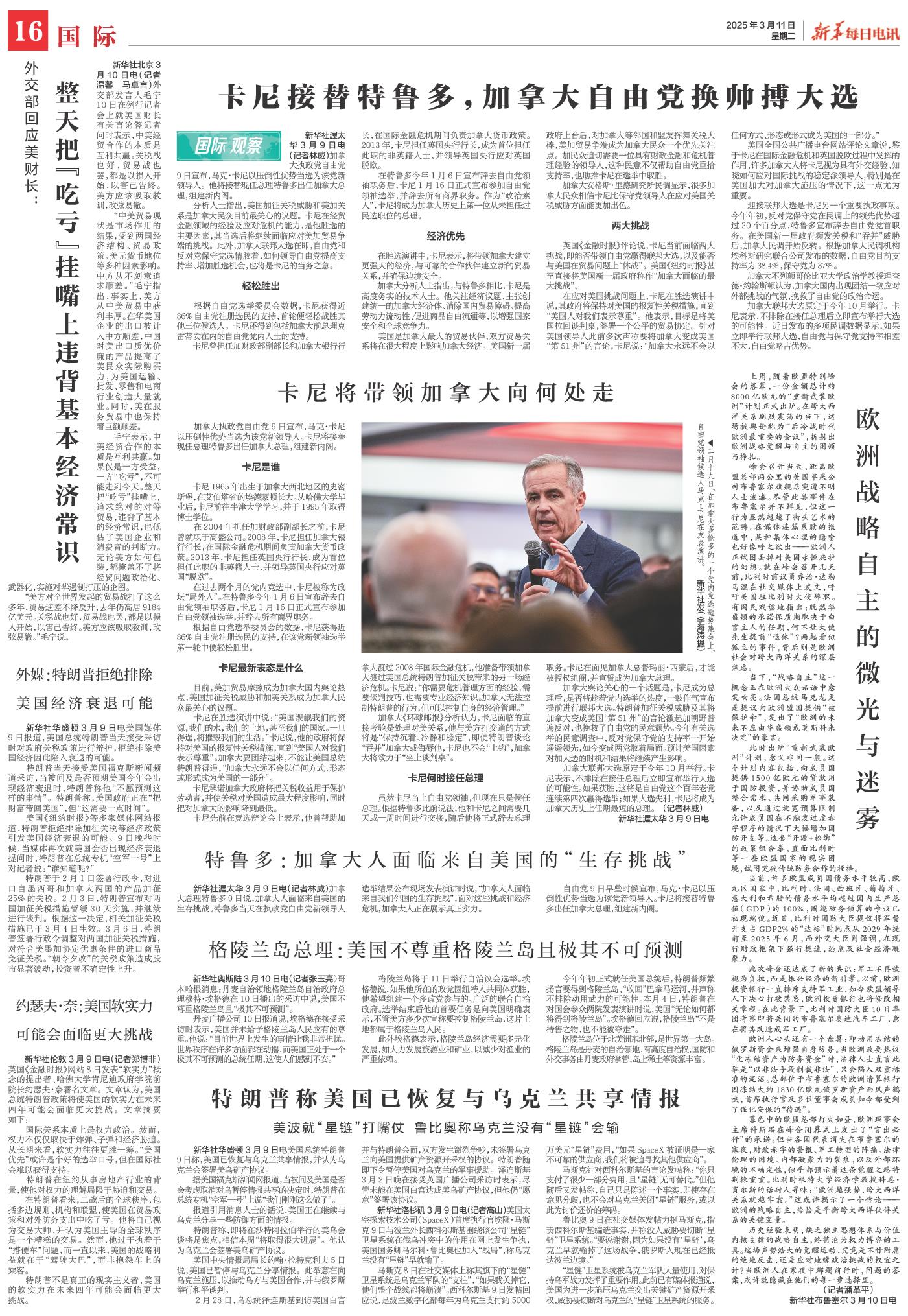 分析人士指出,美国加征关税威胁和美加关系是加拿大民众目前最关心的议题。卡尼在经贸金融领域的经验及应对危机的能力,是他胜选的主要因素,其当选后将继续面临应对美加贸易争端的挑战。此外,加拿大联邦大选在即,自由党和反对党保守党选情胶着,如何领导自由党提高支持率、增加胜选机会,也将是卡尼的当务之急。