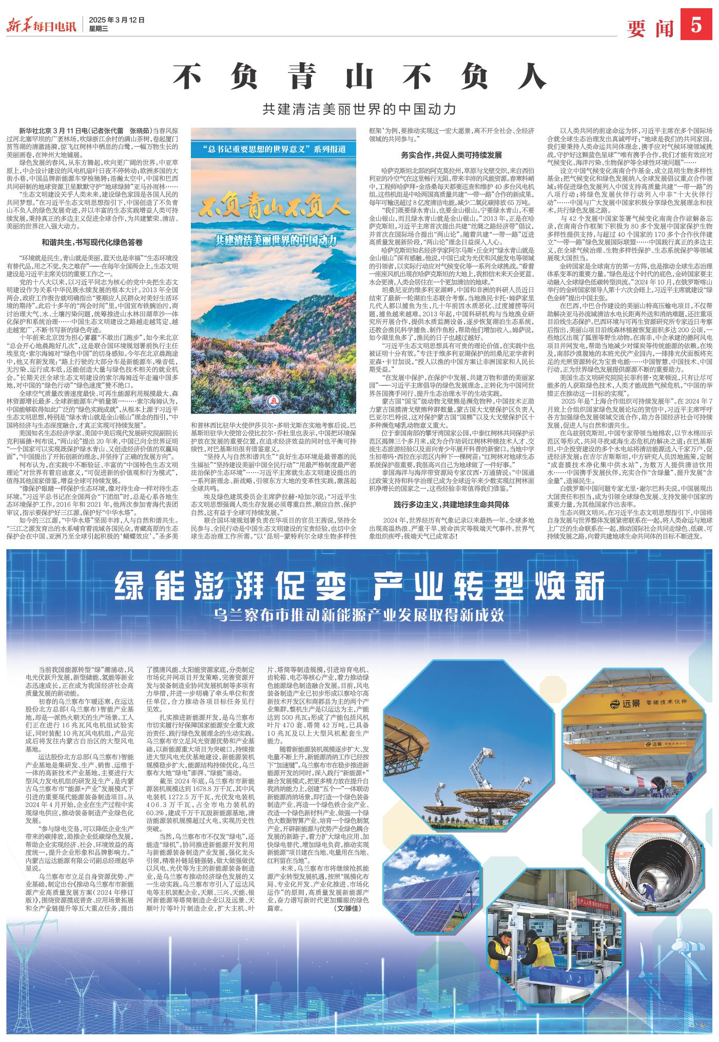 绿色发展的春风,从东方腾起,吹向更广阔的世界。中亚草原上,中企设计建设的风电机扇叶日夜不停转动;欧洲多国的大街小巷,中国品牌新能源车穿梭驰骋;浩瀚太空中,中国和巴西共同研制的地球资源卫星默默守护“地球绿肺”亚马孙雨林……