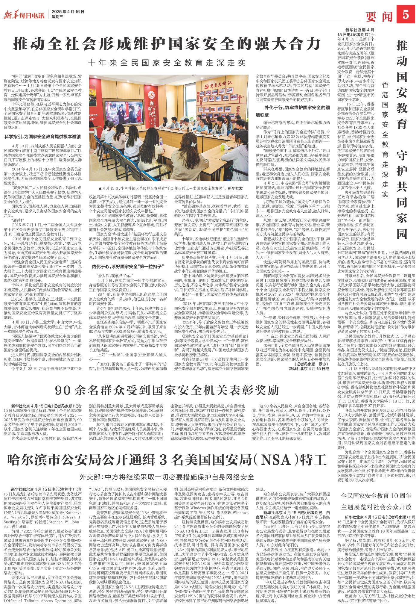 新华社香港4月15日电(记者刘欢)今年4月15日是第十个全民国家安全教育日。2025年,也是香港国安法颁布实施五周年,《维护国家安全条例》颁布实施一周年。连日来,香港特区围绕“全民国家安全教育 走深走实十周年”这一主题,举办了形式多样、丰富多彩的系列活动,在全社会营造维护国家安全的浓厚氛围,进一步增强市民国家安全意识。