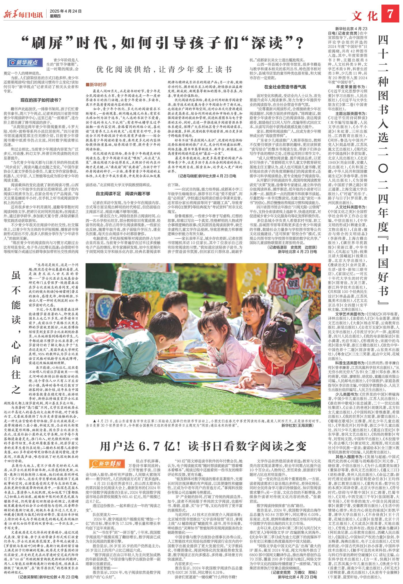 新华社北京4月23日电(记者史竞男)在中宣部指导下,由中国图书评论学会组织评选的2024年度“中国好书”日前揭晓,共有42种图书入选。其中,年度荣誉图书2种,主题出版类8种,人文社科类9种,文学艺术类9种,科普生活类3种,少儿类11种。另有20种图书入围2024年度“中国好书”。