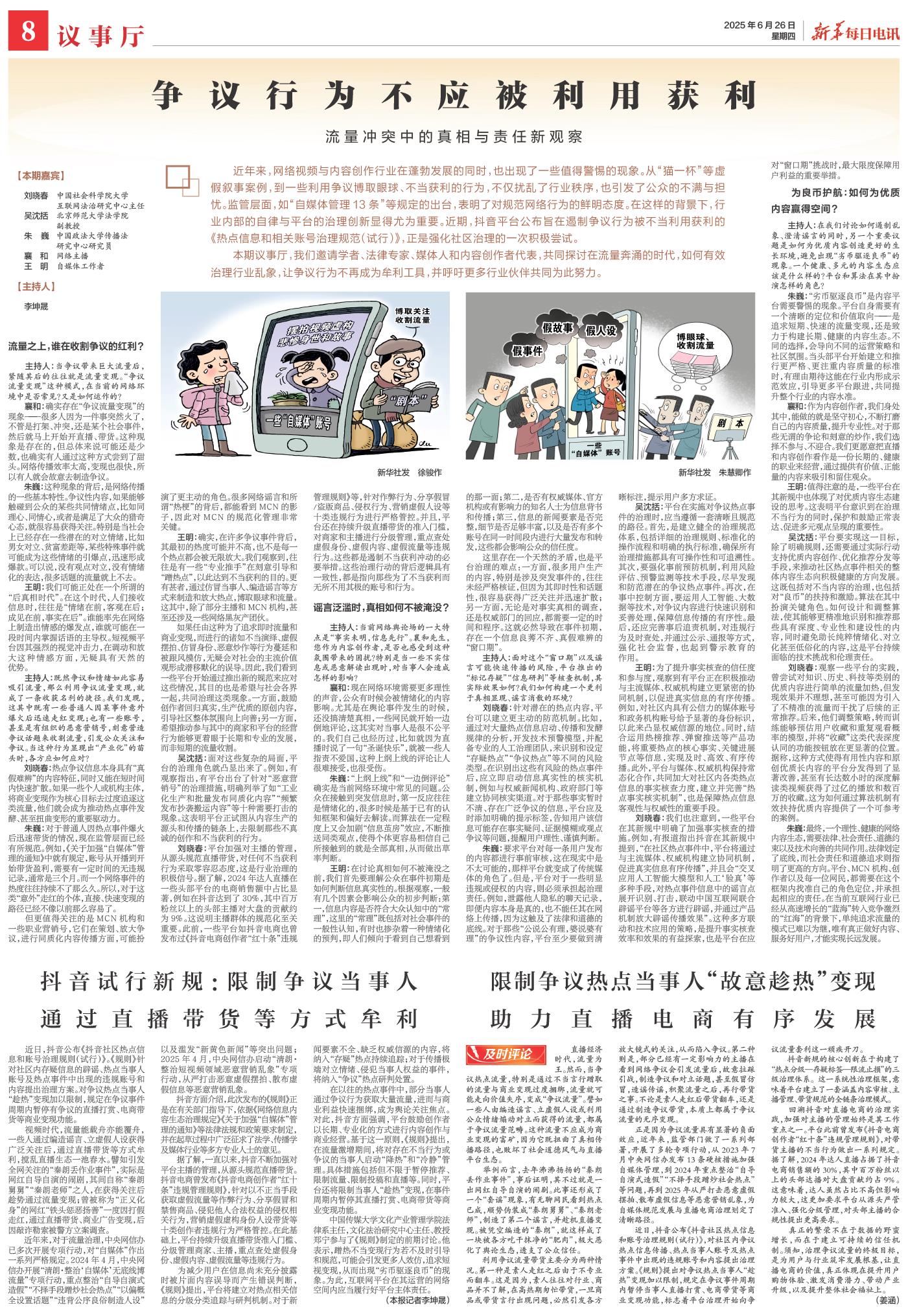中国传媒大学文化产业管理学院法律系主任,文化法治研究中心主任、教授郑宁参与了《规则》制定的前期讨论。他表示,蹭热不当变现行为若不及时引导和规范,可能会引发更多人效仿,追求短视变现,从而出现“劣币驱逐良币”的现象。为此,互联网平台在其运营的网络空间内应当履行好平台主体责任。