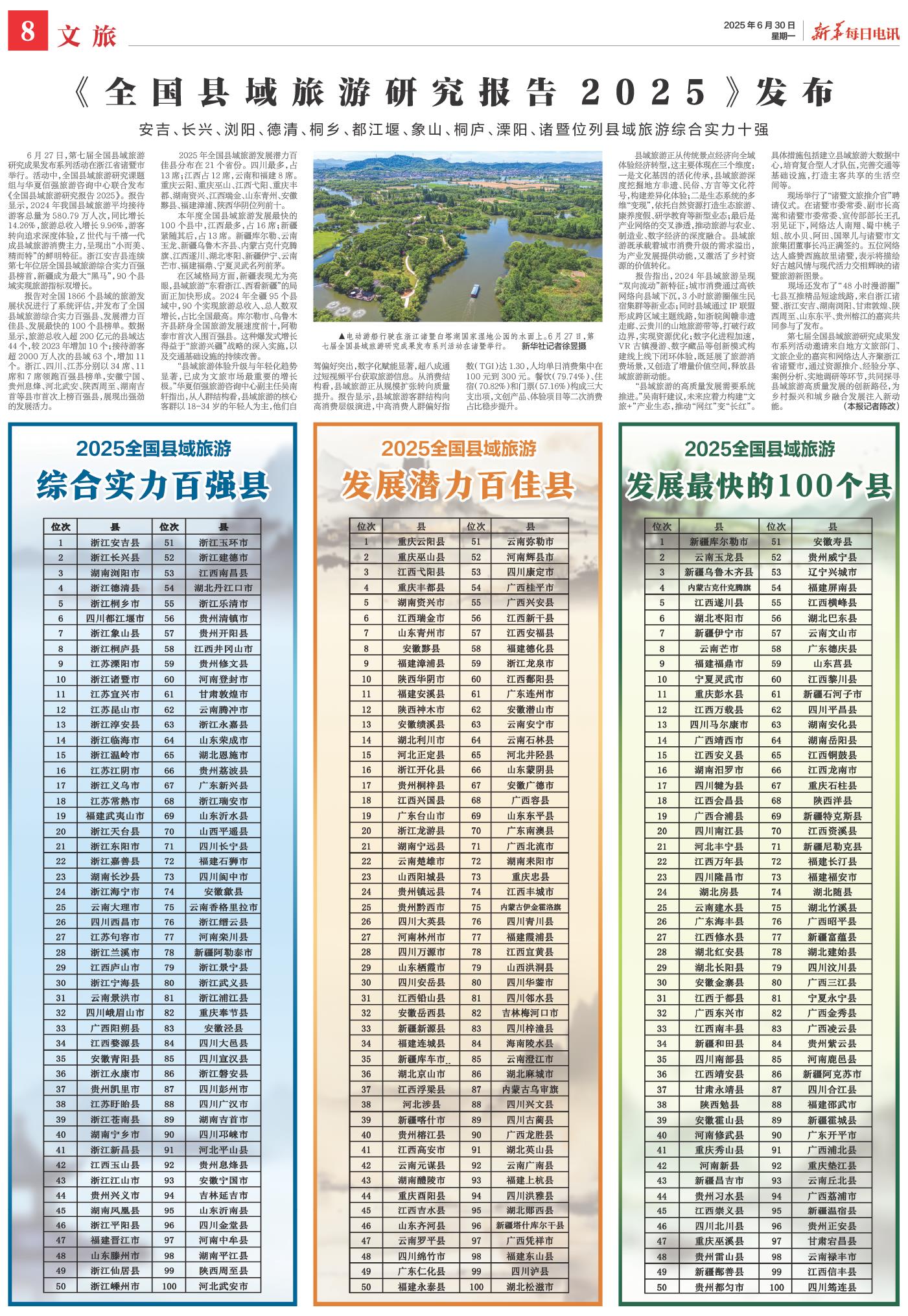 6月27日,第七届全国县域旅游研究成果发布系列活动在浙江省诸暨市举行。活动中,全国县域旅游研究课题组与华夏佰强旅游咨询中心联合发布《全国县域旅游研究报告2025》。报告显示,2024年我国县域旅游平均接待游客总量为580.79万人次,同比增长14.26%,旅游总收入增长9.96%,游客转向追求深度体验,Z世代与千禧一代成县域旅游消费主力,呈现出“小而美、精而特”的鲜明特征。浙江安吉县连续第七年位居全国县域旅游综合实力百强县榜首,新疆成为最大“黑马”,90个县域实现旅游指标双增长。