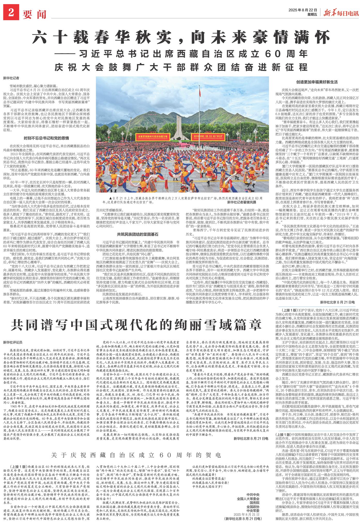 习近平总书记8月21日出席西藏自治区成立60周年庆祝大会。庆祝大会上宣读了中共中央、全国人大常委会、国务院、全国政协、中央军委的贺电,并向西藏自治区赠送了习近平总书记题词的“共建中华民族共同体 书写美丽西藏新篇章”贺匾。