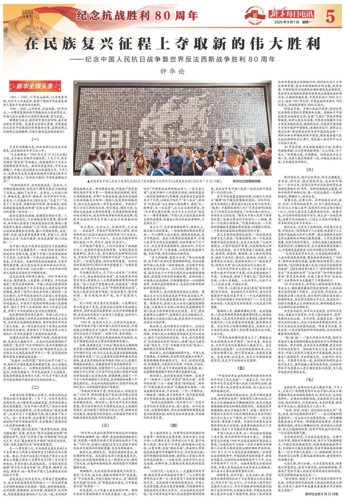 硝烟虽已远去,胜利的号角仍在回响,奋斗的征程未有穷期。民族复兴的伟大梦想,召唤着我们从历史中汲取前行的智慧和力量,在新征程上弘扬伟大抗战精神,不断从胜利走向新的胜利!