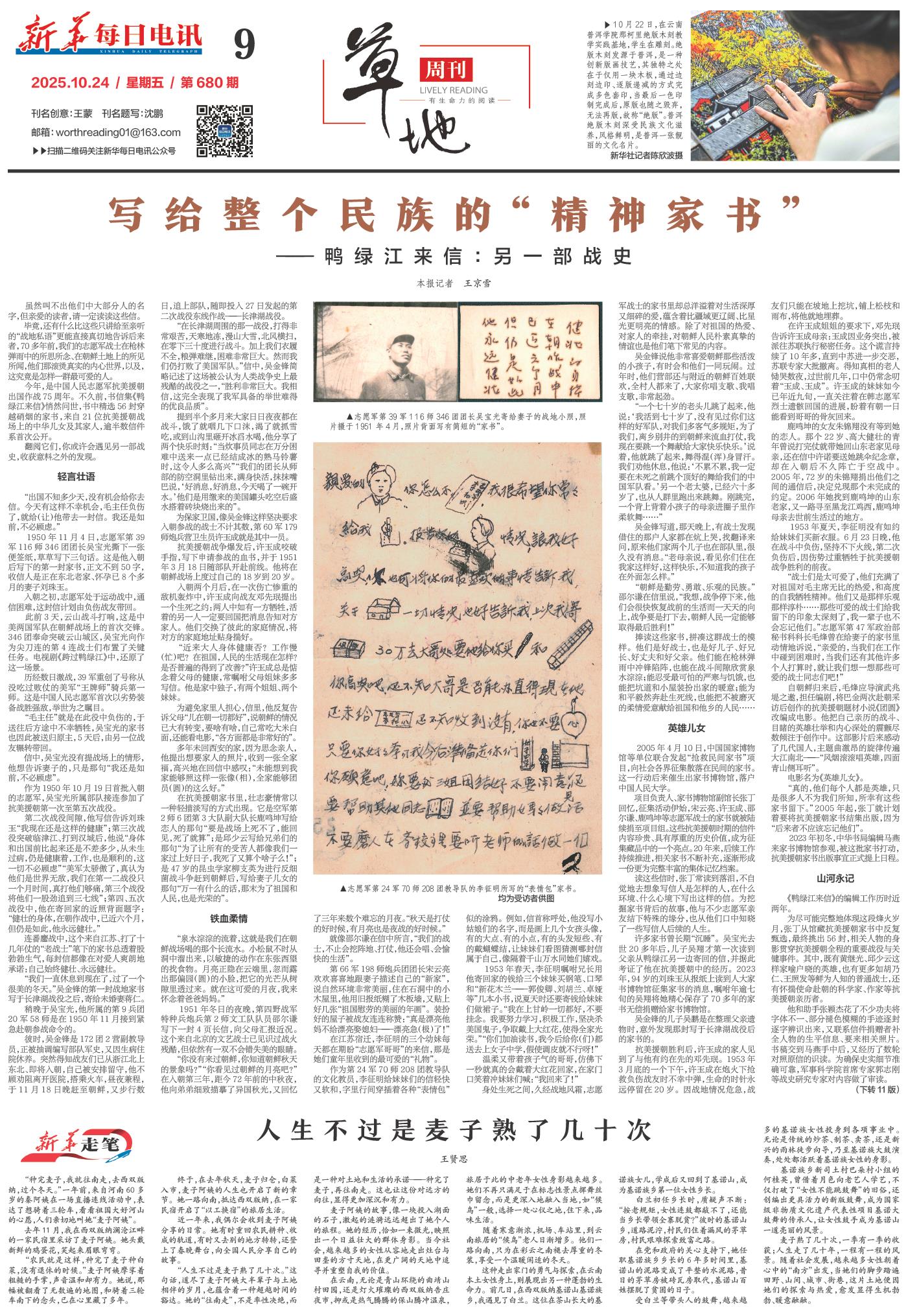 英雄不是天生无畏。在马燕看来,这本书挖掘的是“不一样的抗美援朝史”。编书过程中,她不仅对这段历史有了更多认识,也越发理解70多年前这群人的信念和“那股劲”。“‘保家卫国’不是喊口号。这些家书突出的是一个个活生生的普通人。你会看到他们的情感、他们的时代选择——无论农民、工人、作家、科学家,只要国家需要,没什么可犹豫,我的全部都能付出。”