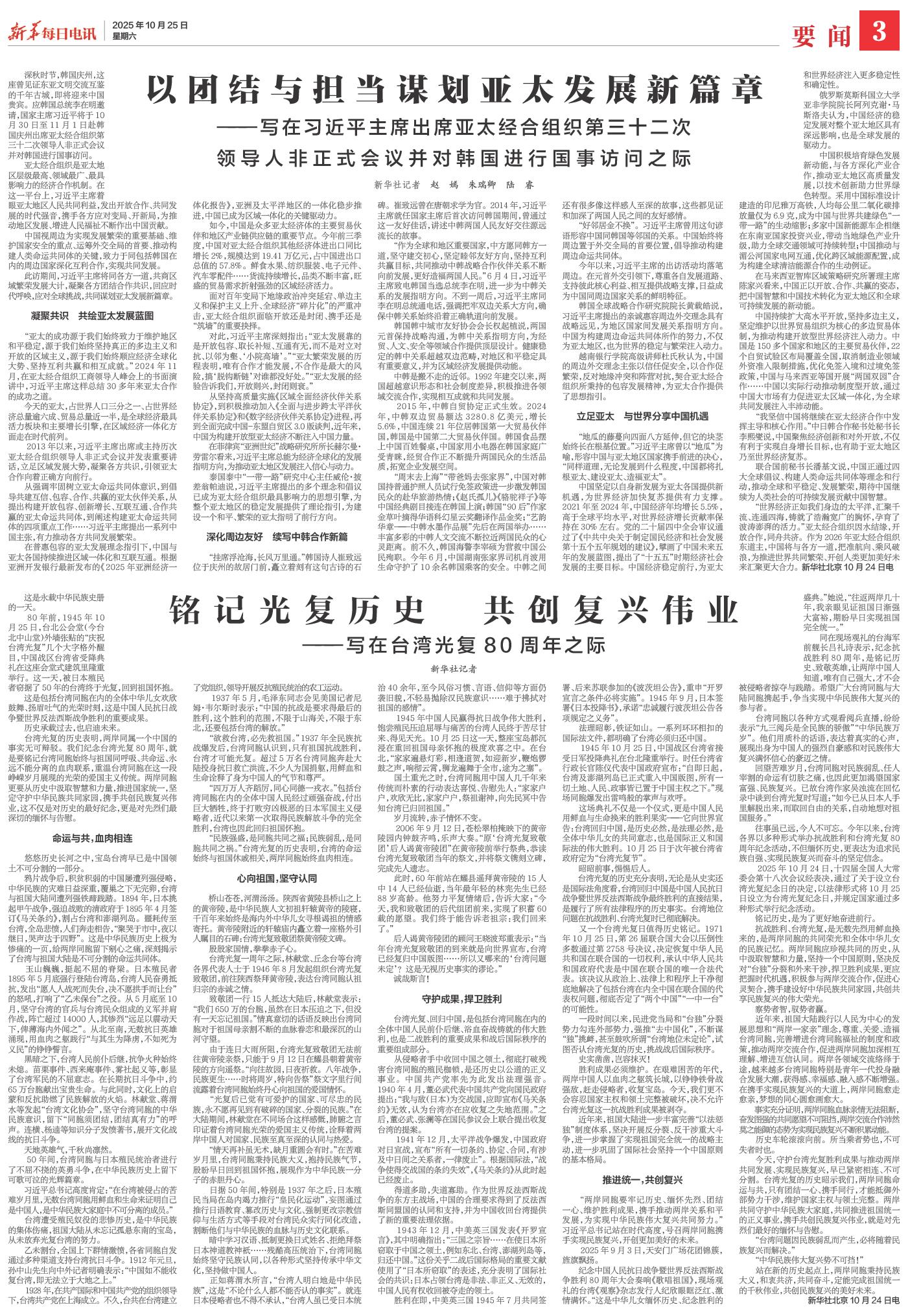 台湾光复的历史表明,两岸同属一个中国的事实无可辩驳。我们纪念台湾光复80周年,就是要铭记台湾同胞始终与祖国同呼吸、共命运、永远不能分离的血肉联系,重温台湾同胞在这一段峥嵘岁月展现的光荣的爱国主义传统。两岸同胞更要从历史中汲取智慧和力量,推进国家统一,坚定守护中华民族共同家园,携手共创民族复兴伟业,这不仅是对历史的最好纪念,更是对先烈们最深切的缅怀与告慰。