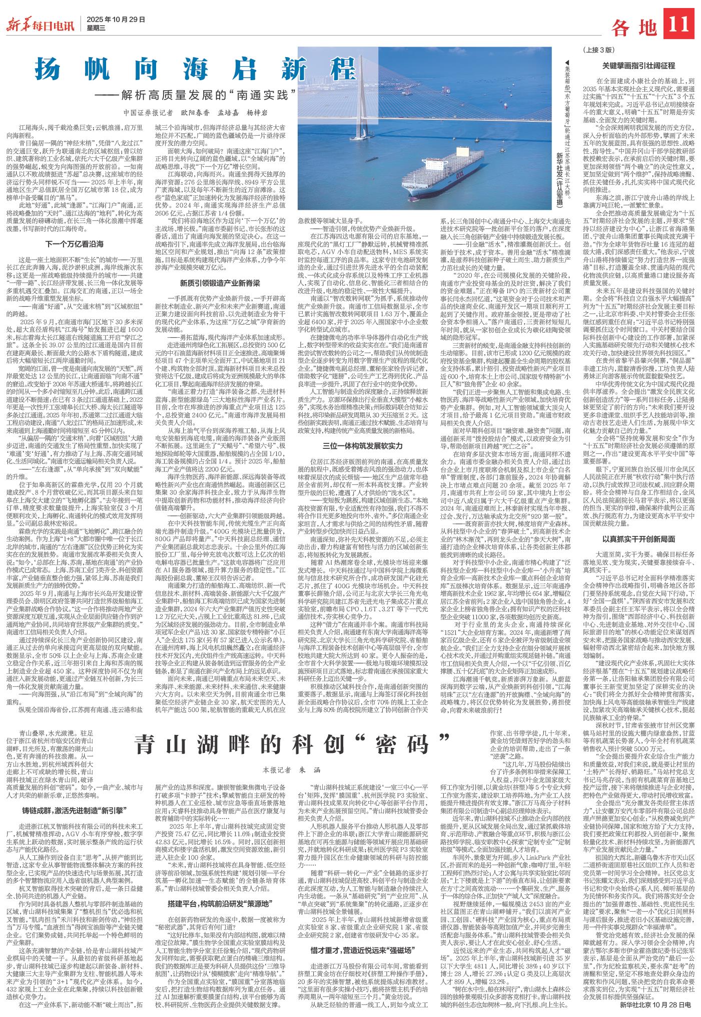 霖鼎光学的实践是南通“飞地孵化”、跨江融合的生动案例。作为上海“1+8”大都市圈中唯一位于长江北岸的城市,南通的“左右逢源”区位优势正转化为实实在在的发展胜势。南通市发展改革委相关负责人说:“如今,‘总部在上海、苏南,基地在南通’的产业协作模式已成常态。上海、苏南工业门类齐全、科创资源丰富,产业链垂直整合能力强,紧邻上海、苏南是我们发展新质生产力的独特优势。”