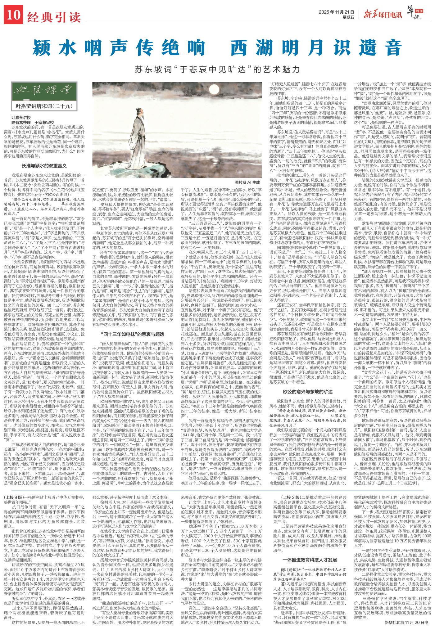 杜甫的《曲江二首》,有一首的开头是这样写的,“一片花飞减却春,风飘万点正愁人”,你要等到万紫千红的花都零落满地,才知道春天走了吗?不是。诗人的感受很敏锐。春光慢慢地来,从含苞到盛开,其中如果有一朵花的一片花瓣飞落,那春光就已经不完整了。何况只要有一片花飞,你就知道那万点花飞跟着马上来了。“一片花飞减却春”,马上就到了“风飘万点正愁人”。所以人世的残缺,是一直不断地转变。苏东坡写的其实是很悲哀的一件往事,他说“与余同是识翁人,惟有西湖波底月”,写得那么悲哀,同时还能够写得那么超逸、潇洒,这个是苏东坡极大的特色。他说四十三年的往事过去了,有谁还记得欧阳修?跟我一样认识欧阳修还怀念欧阳修的人,有谁还存在在这里?