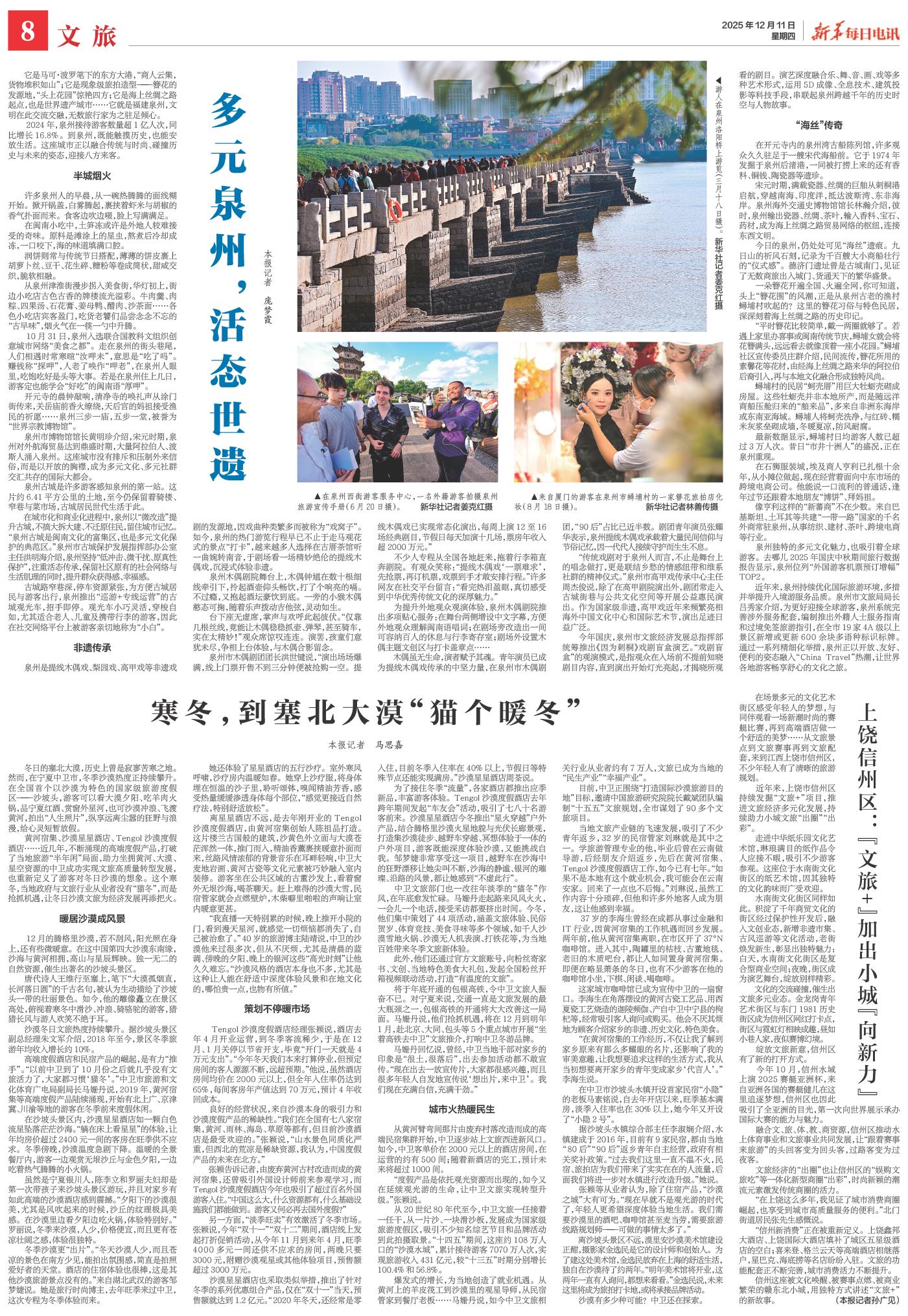 沙漠冬日文旅热度持续攀升。据沙坡头景区副总经理朱文军介绍,2018年至今,景区冬季旅游年均收入增长约10%。