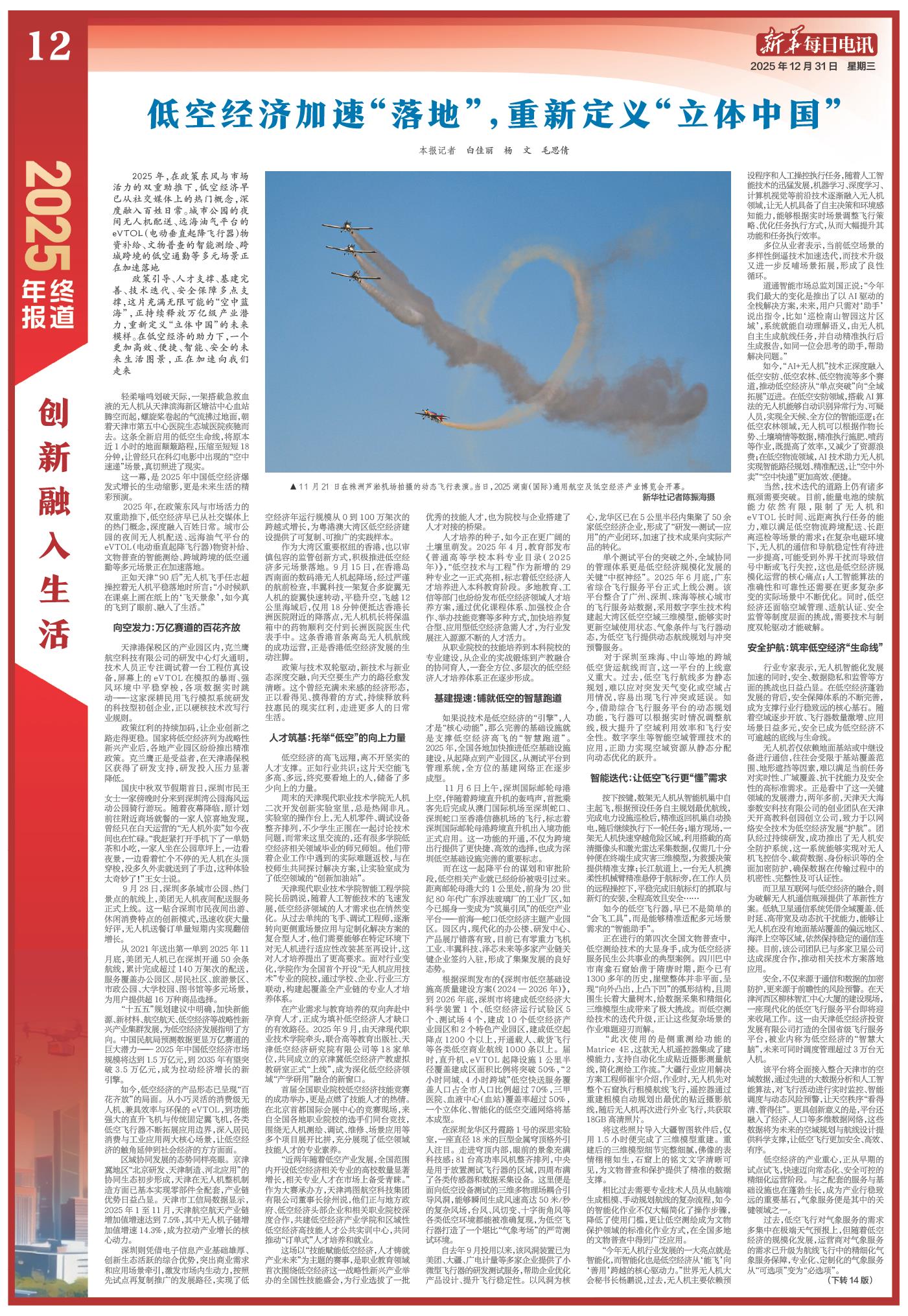 从急救血袋的空中速递,到公园草坪的无人机外卖;从文物保护的智能测绘,到跨城跨境的低空通勤;从电力巡检的高效便捷,到应急救援的精准赋能,低空经济正以看得见、摸得着的方式,深刻改变着城市运行与百姓生活。
