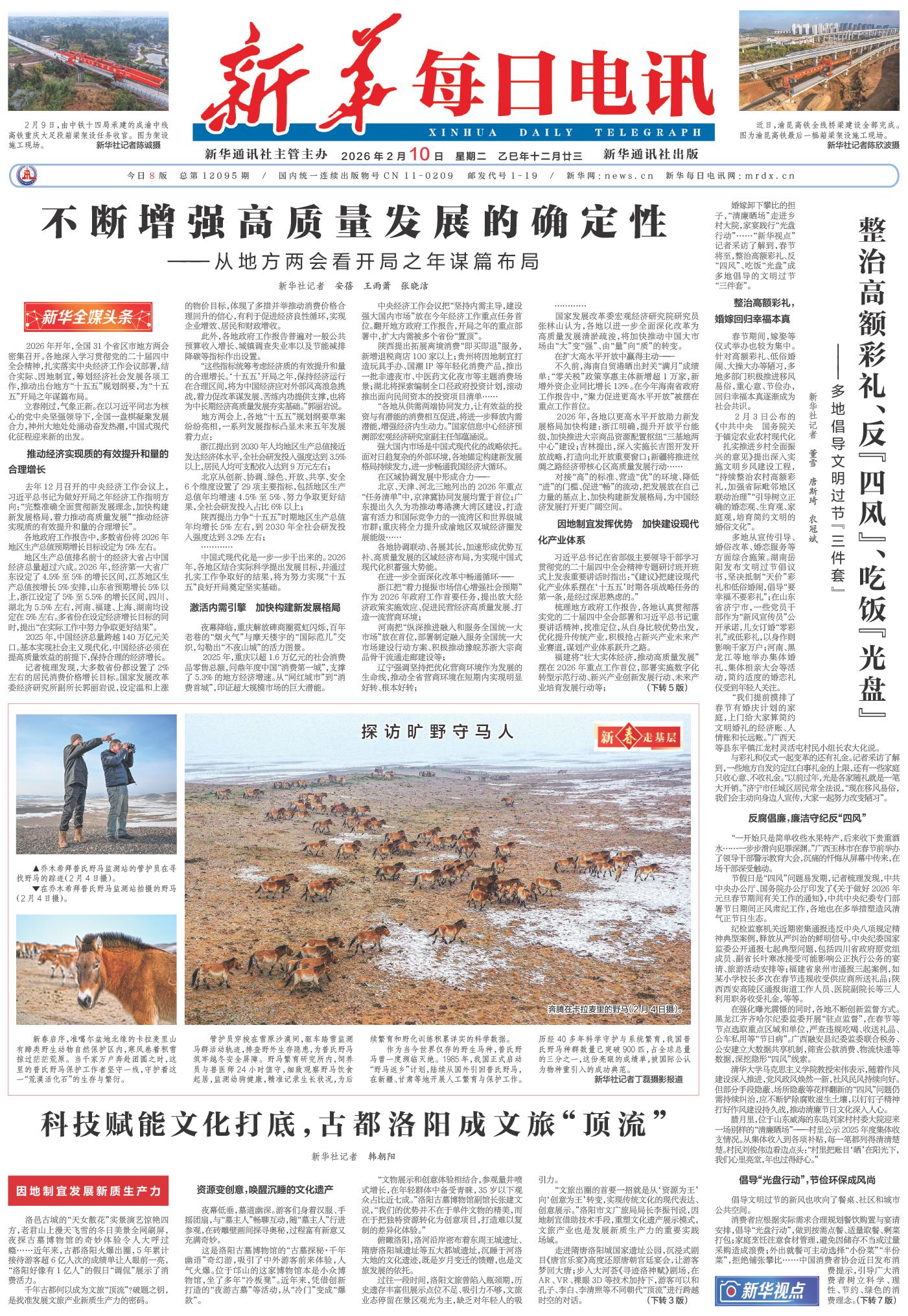 贵州提出实施农村公路安全生命防护工程9000公里,实施危桥改造100座;云南将提升边境管理效能,加大电信网络诈骗等突出违法犯罪预防和打击力度;黑龙江强调坚决当好国家粮食安全“压舱石”,深入实施新一轮千万吨粮食增产计划……