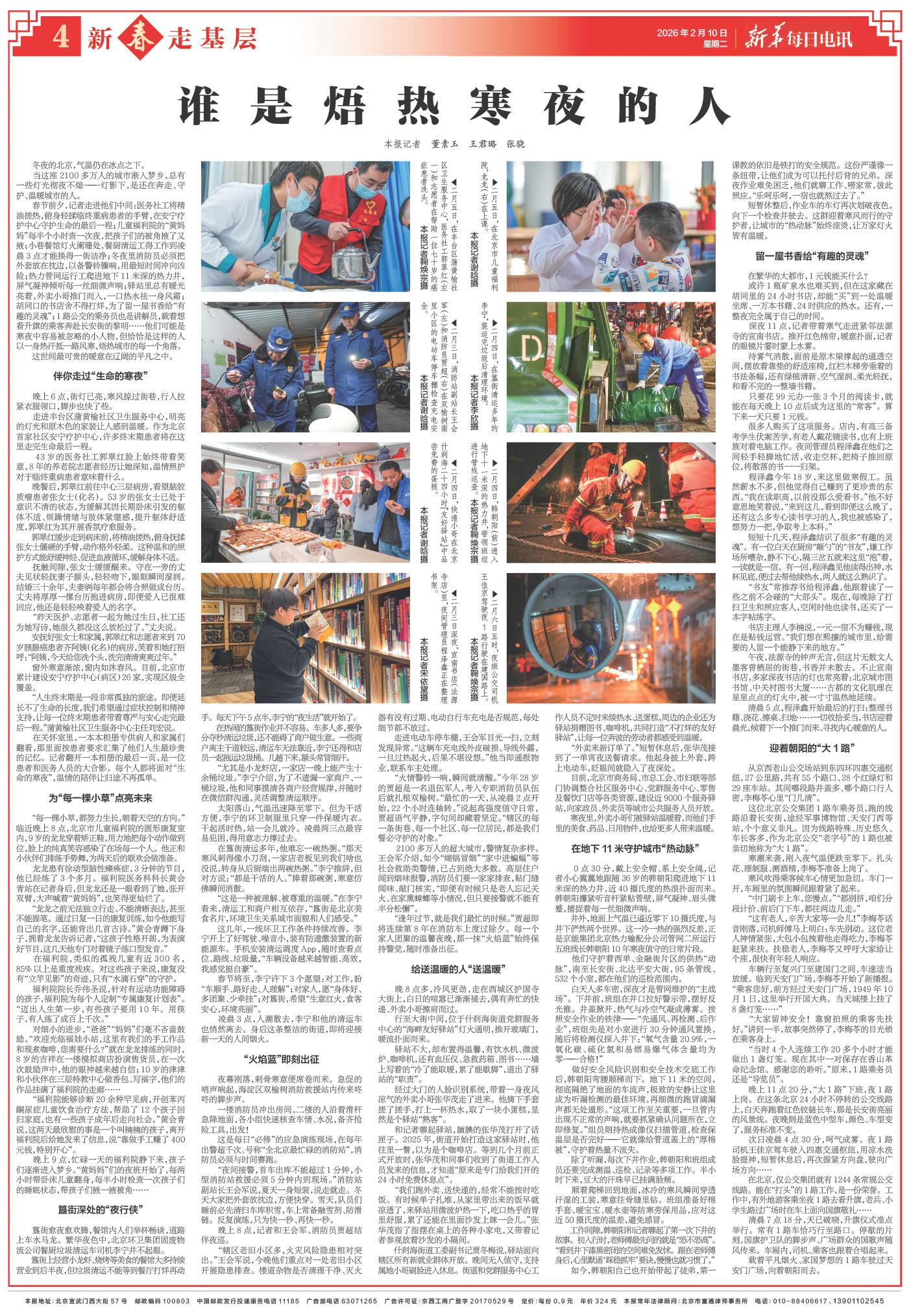 春节前夕,记者走进他们中间:医务社工将精油搓热,俯身轻揉临终重病患者的手臂,在安宁疗护中心守护生命的最后一程;儿童福利院的“黄妈妈”每半个小时查一次夜,把孩子们的被角掖了又掖;小巷餐馆灯火阑珊处,餐厨清运工得工作到凌晨3点才能换得一街洁净;冬夜里消防员必须把外套放在枕边,以备警铃骤响,用最短时间冲向凶险;热力管网运行工爬进地下11米深的热力井,屏气凝神倾听每一丝细微声响;驿站里总有暖光亮着,外卖小哥推门而入,一口热水祛一身风霜;胡同口的书店舍不得打烊,为了留一屋书香给“有趣的灵魂”;1路公交的乘务员也是讲解员,载着想看升旗的乘客奔赴长安街的黎明……他们可能是寒夜中容易被忽略的小人物,但恰恰是这样的人以一身热汗抵一路风寒,焐热城市的每一个角落。