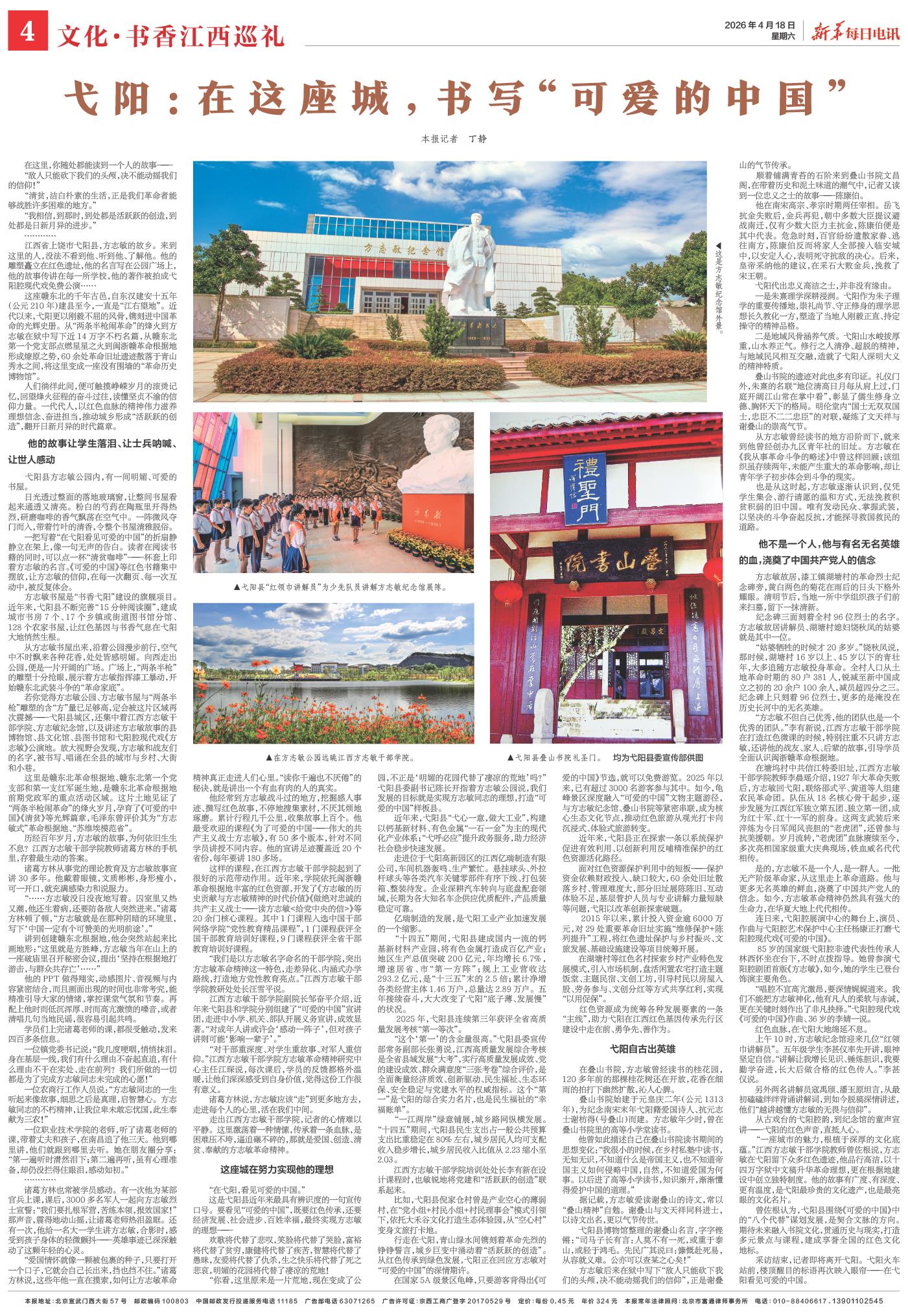 “一座城市的魅力,根植于深厚的文化底蕴。”江西方志敏干部学院教师曾佐根说,方志敏在弋阳留下众多红色遗迹,他品行高洁,以十四万字狱中文稿升华革命理想,更在根据地建设中创立独特制度。他的故事有广度、有深度、更有温度,是弋阳最珍贵的文化遗产,也是最亮眼的文化名片。
