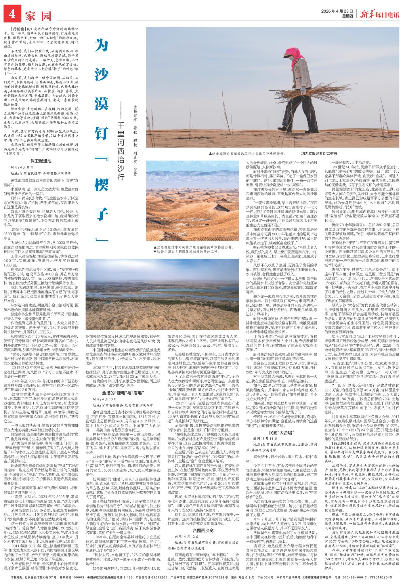 【行后感】开春以来,记者从河西走廊最西端的敦煌市出发,陆续行进至酒泉市、张掖市等多地,最后抵达河西走廊最东端的武威市。在沙区植绿播撒“希望”,已是各地干部群众的共同实践。